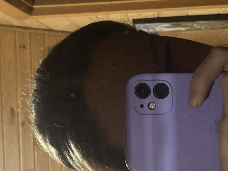 A selfie in a mirror shows a person holding a purple smartphone. The camera lens area is visible with two circular lenses and a flash. The person's face is partially obscured by the phone, but their dark hair and skin tone are discernible. The background includes wooden paneling, possibly part of a room's interior. The mirror creates a slightly inverted perspective.
