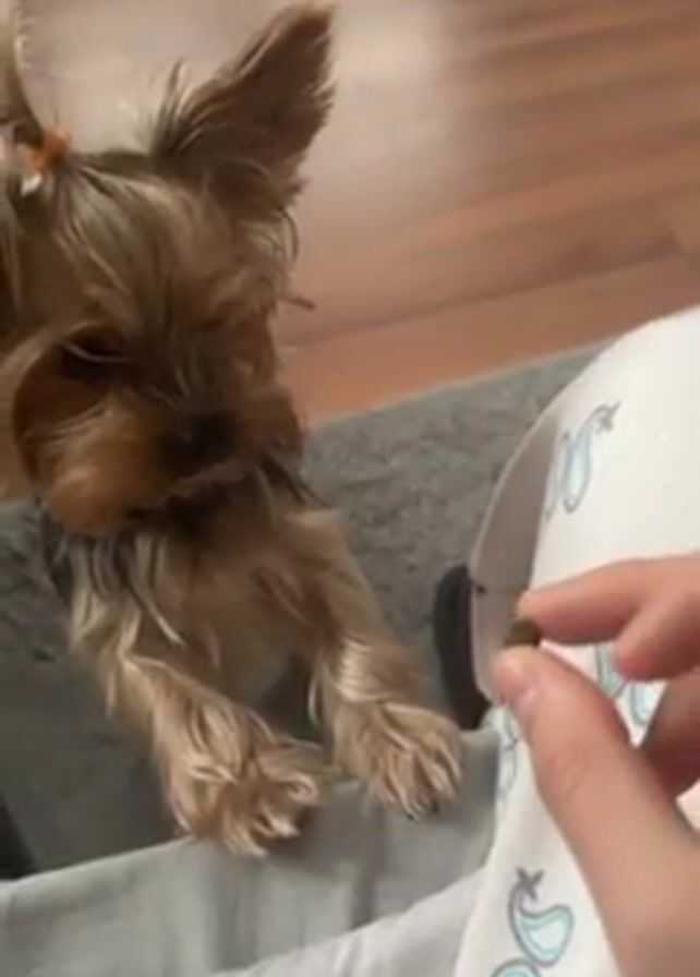 A hand holds out a piece of kibble to a small Yorkshire terrier with a small orange hair tie visible in its hair