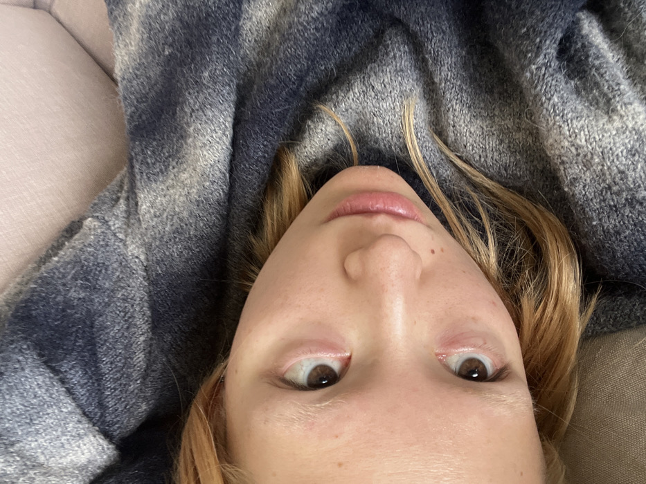 A close-up, diagonally oriented portrait depicts a young individual with fair skin, light brown hair, and open brown eyes. Redness is visible on the lower eyelids. The lips are slightly parted. The subject gazes directly towards the viewer. A blue and gray mottled knit garment covers the individual's body from the neck down and partially surrounds the head. A blurred, light-colored, soft surface is present in the background. The scene is consistent with an indoor environment. No visual details within the image allow for the identification of a specific location in Tel Aviv-Yafo, Israel.