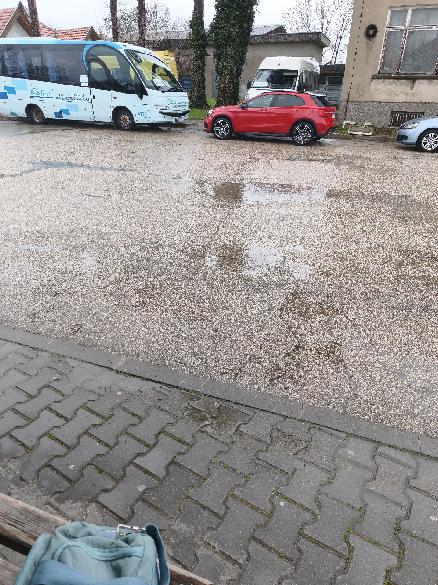 n outdoor parking area in Veliko Tarnovo, Bulgaria, likely on a wet day. A light blue and white bus with "B&B Trans" written on it is parked on the left side of the image. A red SUV is parked to the right of the bus. Further to the right, next to a building, is a light blue car. Behind the SUV is a white van. The pavement is wet and reflective, with several puddles visible. The foreground features a paved area with interlocking bricks, part of a wooden bench, and a blue bag resting on it. The background includes buildings and greenery.