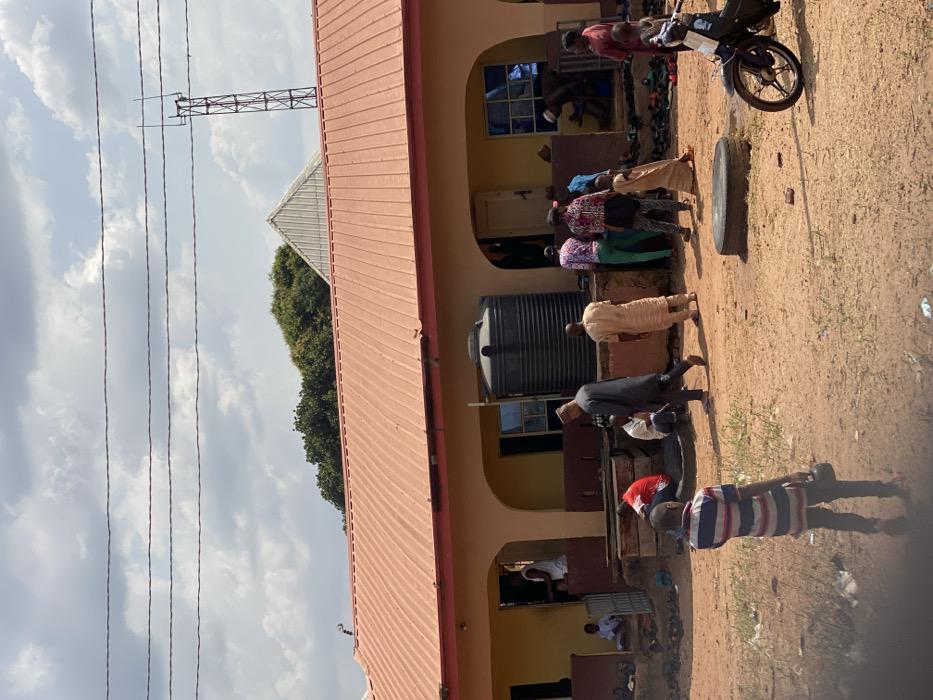 This image depicts an outdoor scene in Ameka, Nigeria, featuring a single-story building with light brown walls and a red corrugated metal roof