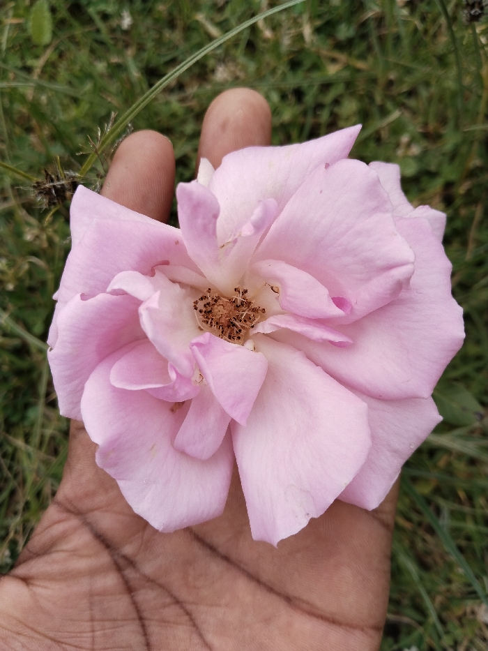 A light pink rose, approximately 8-10 cm in diameter, is held in the open palm of a human hand. The rose displays numerous overlapping petals, primarily pale pink with slightly darker hues towards the edges, and a visible cluster of brown-tipped stamens at its center. The hand, exhibiting a medium skin tone and visible palm lines, supports the flower from below, with the tips of the thumb and two fingers partially visible at the upper left. The background consists of out-of-focus green grass with some darker plant debris. The scene is located in Engineer, Kenya.