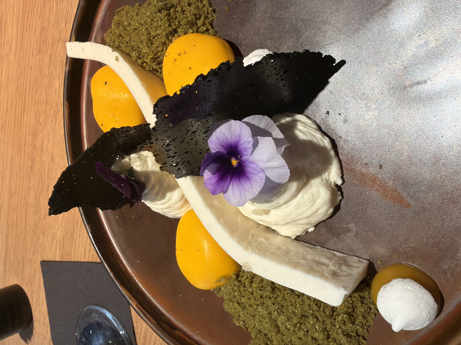- "A close-up image displays a meticulously plated dessert presented on a dark, reddish-brown, circular plate" by FM-grnl23, licensed under CC BY 4.0
