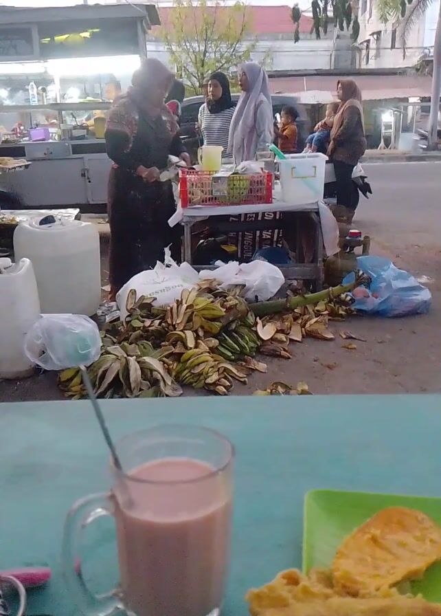A woman in a black dress and hijab is standing near a food cart on the side of a street, and is interacting with several other people in the area. The cart appears to be a street vendor, with bananas and various food items on display. Behind the cart, there are several white plastic containers. On the right side of the frame, there is a glass with a light brown liquid, likely a drink, and a green plate with fried food. The background shows buildings and trees along the street. The scene suggests a busy street food stall, with the woman interacting with customers.