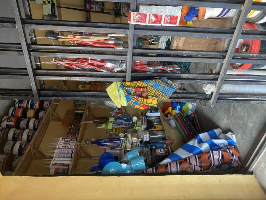 This image captures the interior of a retail shop located in Moniya, Nigeria, viewed through a partially open black metal grate door