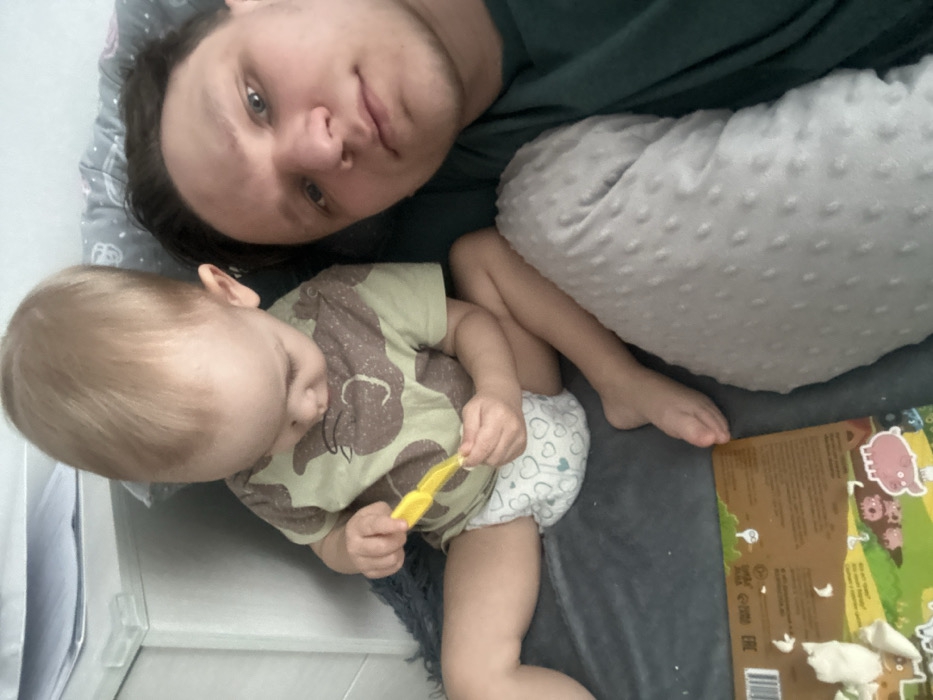 This indoor residential scene, located in Perm, Russia, features two individuals: an adult male and a young child. The adult male, positioned on the right, is depicted from the chest up, lying on his side, with his head slightly elevated. He has short dark hair and fair skin, wearing a dark green shirt, and is looking directly towards the camera with a neutral expression. A light grey, textured pillow is partially visible next to him. To the left of the male, a young child with light brown hair and fair skin is seated, facing downwards and away from the camera. The child wears a light green and brown patterned t-shirt and a white diaper with light blue heart patterns. The child is actively engaged, holding a small yellow plastic object, possibly a toy spoon or utensil, in both hands. Below the child, a partially visible open book or board game featuring cartoon animal illustrations (including a pink pig-like creature) and some white malleable material (resembling clay or dough) is present. Both individuals are situated on a dark grey, plush blanket or bedding material. A bunched-up dark blue/grey textile is visible behind the child, and a light-colored furniture piece (possibly a chest of drawers or cabinet) is in the background to the far left.
