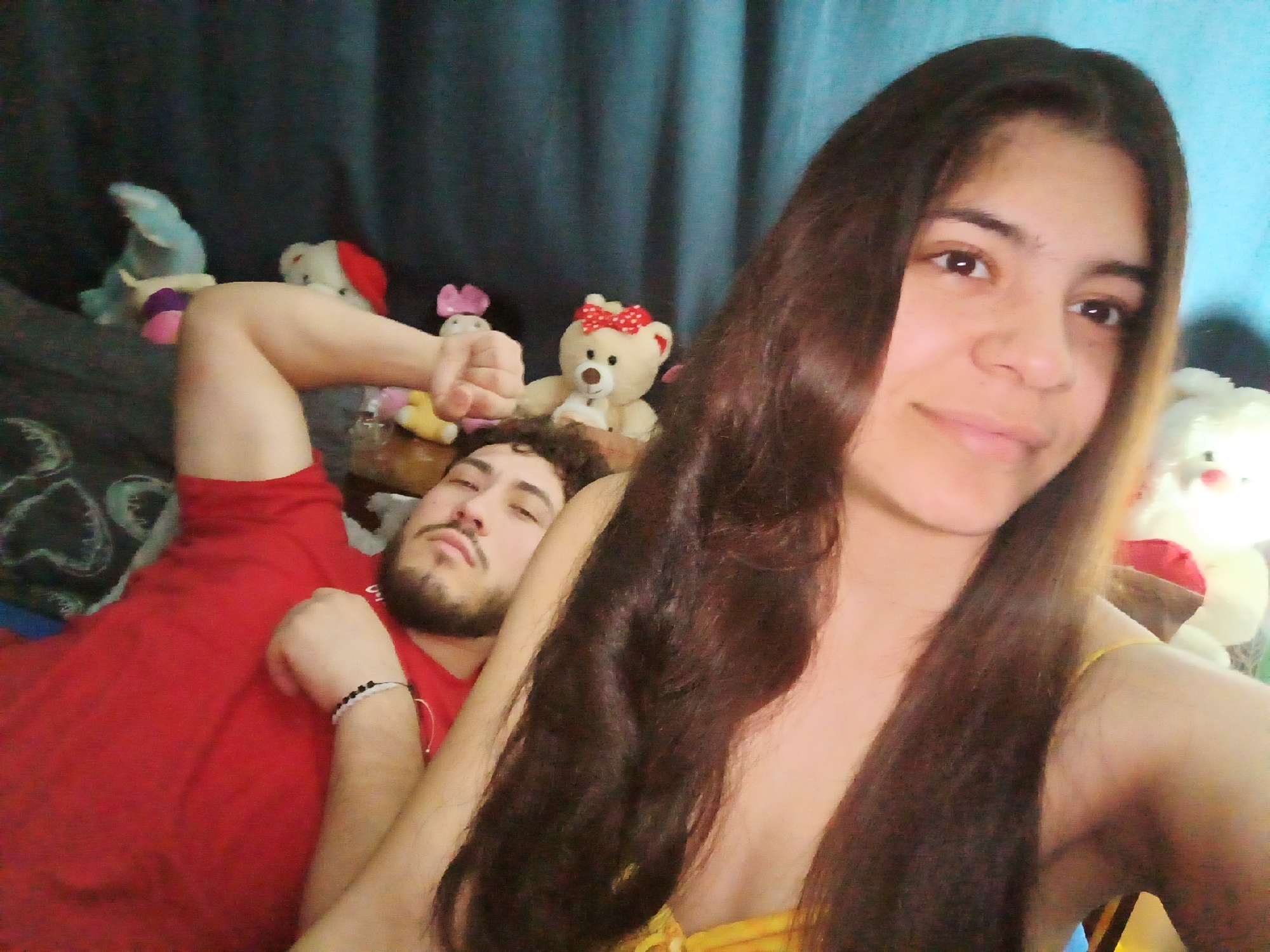 The image depicts two individuals indoors, likely in a bedroom or living room. The exact location within the city of Roman, Bulgaria, cannot be determined from the visual evidence. In the foreground and to the right, a female with long, dark brown hair parted down the middle is taking a selfie. She has brown eyes and a slight smile, wearing a yellow, thin-strapped top. Her left shoulder and arm are partially visible. In the background, positioned to the left, a male is lying down on his back. He has dark, curly hair, a dark beard, and a mustache. His eyes appear closed or are directed downwards. He is wearing a red t-shirt, and his right arm is bent with a hand near his head or chest. He wears a bracelet with black and white beads on his right wrist. The male is resting on dark-colored bedding or a couch, which has a subtle dark patterned design visible on the left. The background behind the individuals features several plush toys, including a light blue animal, a white bear with a red hat, and a tan teddy bear wearing a red polka-dot bow tie. Other indistinct plush items are also visible. The overall background appears to be a dark blue or teal curtain or wall. The scene is illuminated by indoor lighting.