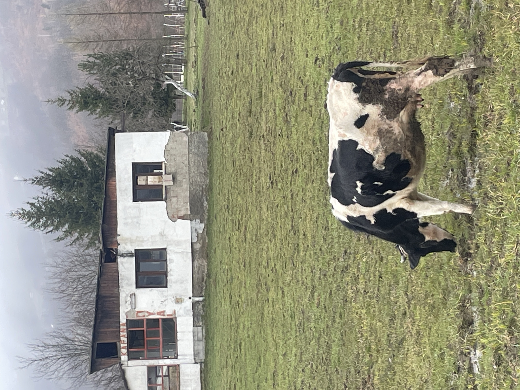The image depicts a rural scene in Lepenac, Montenegro, under an overcast sky. In the foreground, a black and white Holstein-Friesian type cow is observed grazing in a muddy, grassy field. Its hindquarters and lower legs are heavily soiled with dark mud. The cow's head is lowered to the ground, indicating it is feeding. In the midground, a dilapidated single-story building with white, peeling plaster walls and a grey foundation is visible. The roof structure is composed of weathered dark wood planks, with sections appearing damaged or partially collapsed. Red lettering, partially legible as "KAFANA" and "OYAL", is painted on the front facade, above and beside a large window opening with red-framed panes, some of which are missing. Two other windows with dark frames are present on the facade, one containing a piece of cardboard or similar material. The background features a scattering of bare deciduous trees and several dark green coniferous trees (pines or firs). A distant, misty mountain or hill range is visible under the dull, grey sky. The ground throughout the scene consists of green grass interspersed with dark, muddy patches. No human figures are present.