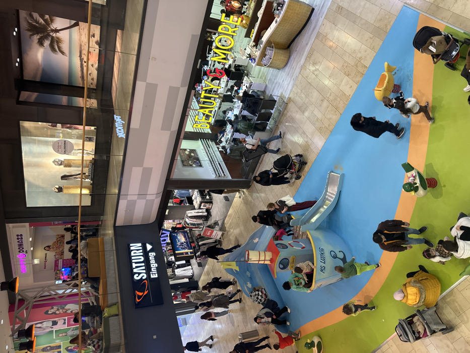 shopping mall interior. The mall is located in Ludwigshafen am Rhein, Germany, at latitude 49.487 and longitude 8.446. The image captures a brightly lit, modern interior with a large, open space. The upper level features a glass railing, behind which are various stores and shop displays. The ground level is a large open space with children playing on a blue, yellow, and green play area. There are several adults observing and accompanying the children. One adult is standing near the railing on the upper level and looking down at the play area. Several adults are walking throughout the mall, and there are many children present. On the upper level, there are several signs, including "SATURN EINGANG" and "BEAUTY & MORE". The play area features a large, blue ship-shaped structure with the name "MS LUXWIG" written on it. The ship has a slide and other play features. The play area is surrounded by a green, yellow, and blue border. The floor throughout the mall appears to be tiled in beige and white. The overall scene is one of bustling activity and joyful movement.