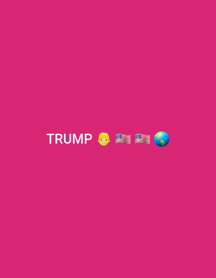 A digital graphic, located or displayed in Gorna Oryahovitsa, Bulgaria, features a solid magenta background. Horizontally aligned near the center of the frame are the white uppercase letters "TRUMP," followed sequentially by a blonde-haired person emoji, two American flag emojis, and a blue and green globe emoji. No additional subjects, actions, or environmental details are present beyond these elements.