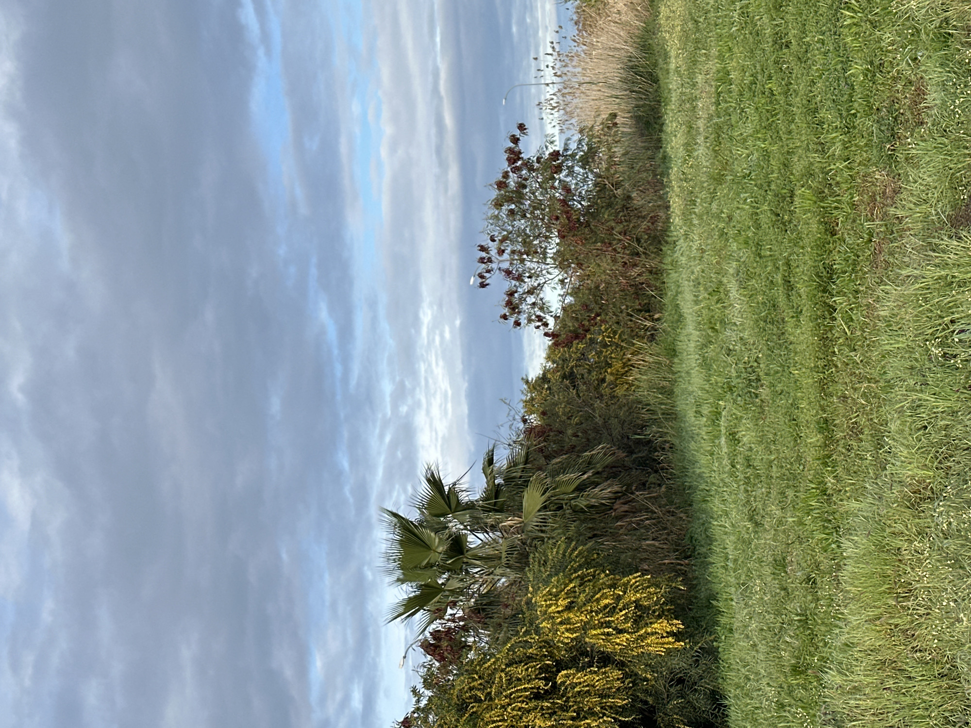 This image depicts an overgrown natural landscape under a partially cloudy sky. The foreground consists of dense, light green grass with scattered small white flowering plants. In the midground, a line of varied vegetation extends horizontally across the frame. On the left, a large shrub or tree with abundant yellow blossoms is visible. To its right, a cluster of fan palm trees with prominent green fronds rises above other foliage. Further right, a deciduous tree with dark reddish-brown leaves stands, followed by a thick patch of tall, dry, straw-colored reeds or grasses on the far right. Two white streetlights with curved poles are visible, one positioned above the left side of the palm trees and another emerging from behind the tall reeds on the right. The background features a sky with extensive gray stratocumulus clouds interspersed with patches of clear blue sky. No people, animals, or specific actions are depicted. The scene is consistent with an unmaintained natural or semi-wild area within the city of Fethiye, Turkey.