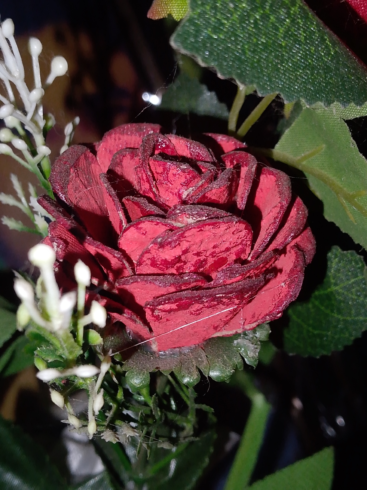 A close-up of a red rose with white and green artificial flora attached. The rose petals appear to be textured and lined in a dark color. Fine filaments resembling cobwebs are visible across the rose. The leaves are a solid green. The location of the image is unknown.