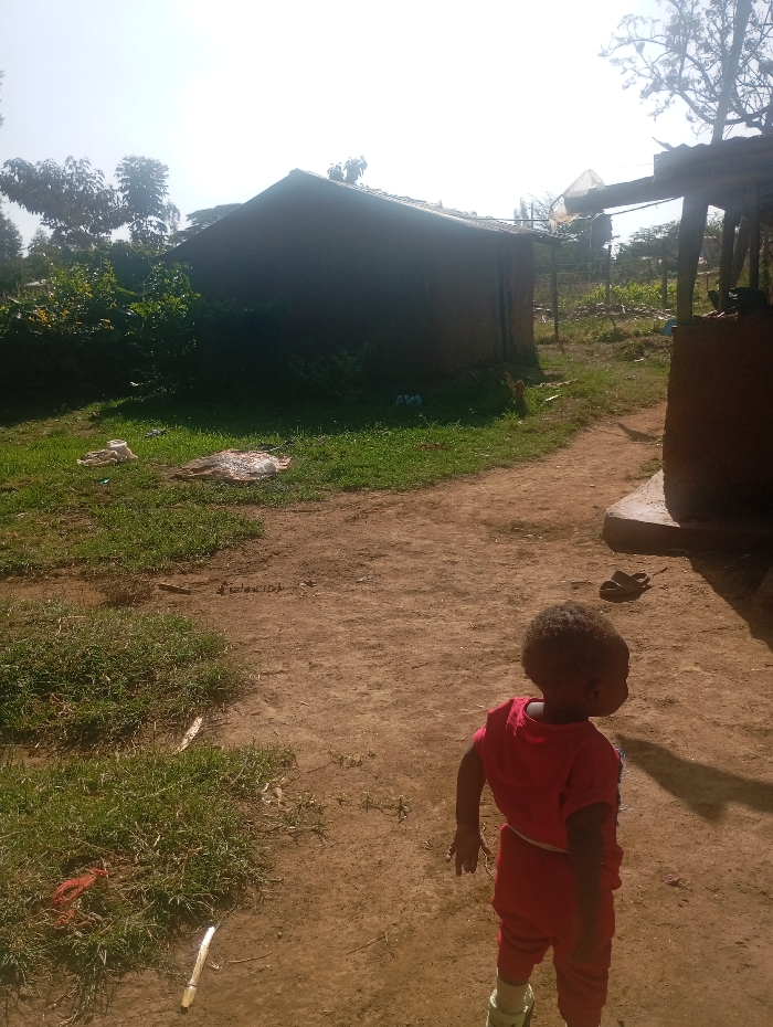 A young child in a red outfit stands in a dirt yard, back to the camera. A humble, mud-walled house stands in the background, with green grass and scattered debris around its base. Trees and vegetation surround the scene. Part of another mud structure is visible on the right. The sun is bright, casting shadows, and creating a contrast between the dark house and the light-colored ground.