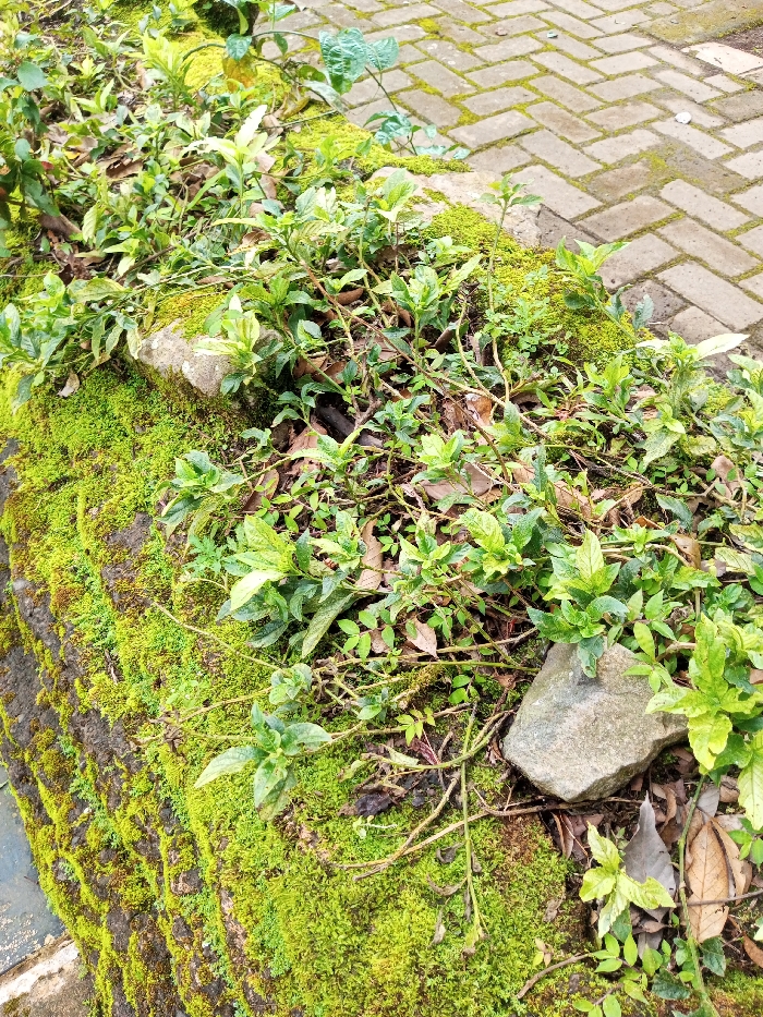 In Kanand, India, an outdoor scene captures a lush, unkempt environment. A prominent dark, multi-layered structure, likely stone or concrete, dominates the left foreground, entirely blanketed in vibrant green moss. Various small, leafy green plants, some with lighter green hues, grow densely on top of and around this moss-covered formation, interspersed with several dry brown leaves and two irregularly shaped, light gray rocks. To the right, a paved pathway constructed from light brown rectangular bricks laid in a herringbone pattern is partially visible. Green moss patches are present within the crevices of the bricks, particularly where the paving meets the dense vegetation. No individuals or animals are present.