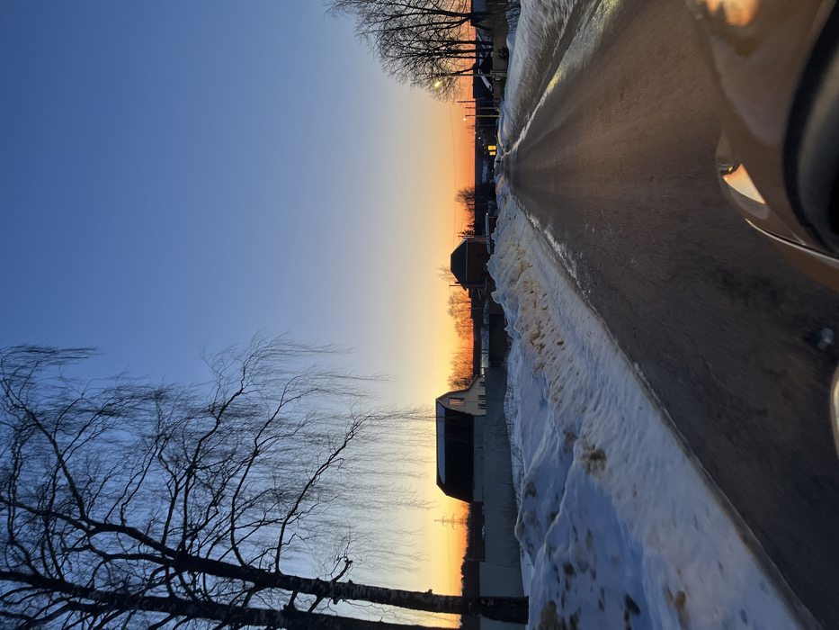This image depicts a snow-lined rural road in Раздолье, Russia, during twilight. The scene is captured from inside a vehicle, with part of the hood visible in the lower right foreground. The asphalt road, appearing damp or icy, extends into the distance, flanked by substantial dirty snow banks on both sides. To the left, a tall, bare deciduous tree (likely a birch) stands in silhouette against the sky, with a light-colored fence and a two-story house featuring a dark gable roof positioned behind the snow bank. Further left, a power line tower is faintly visible against the horizon. To the right, another line of bare deciduous trees and a utility pole with an illuminated street light are present, alongside another residential structure. The sky transitions from a deep blue overhead to a vivid orange and yellow gradient at the horizon, indicating sunset or sunrise. No individuals are visible.