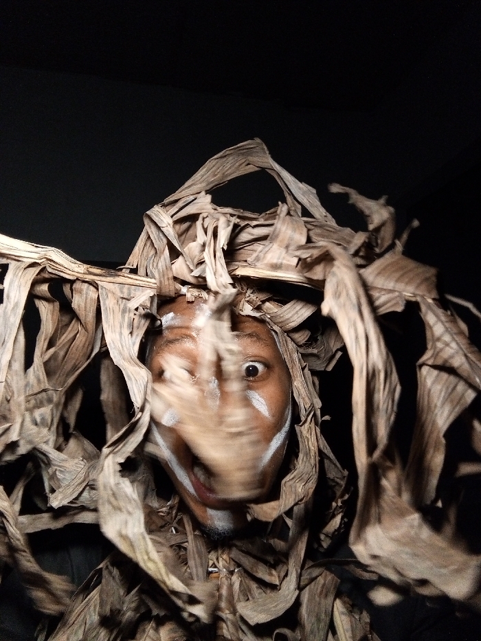 A person covered in dried banana leaves against a dark background. The person has white paint markings on their face, including around the eyes and cheeks. One eye is wide open, and the other is partly obscured by the person's hand, which is blurred due to movement. The leaves create a wild and dramatic effect, suggesting a costume or ritualistic attire. The lighting is low, adding to the mysterious and perhaps eerie atmosphere of the image.
