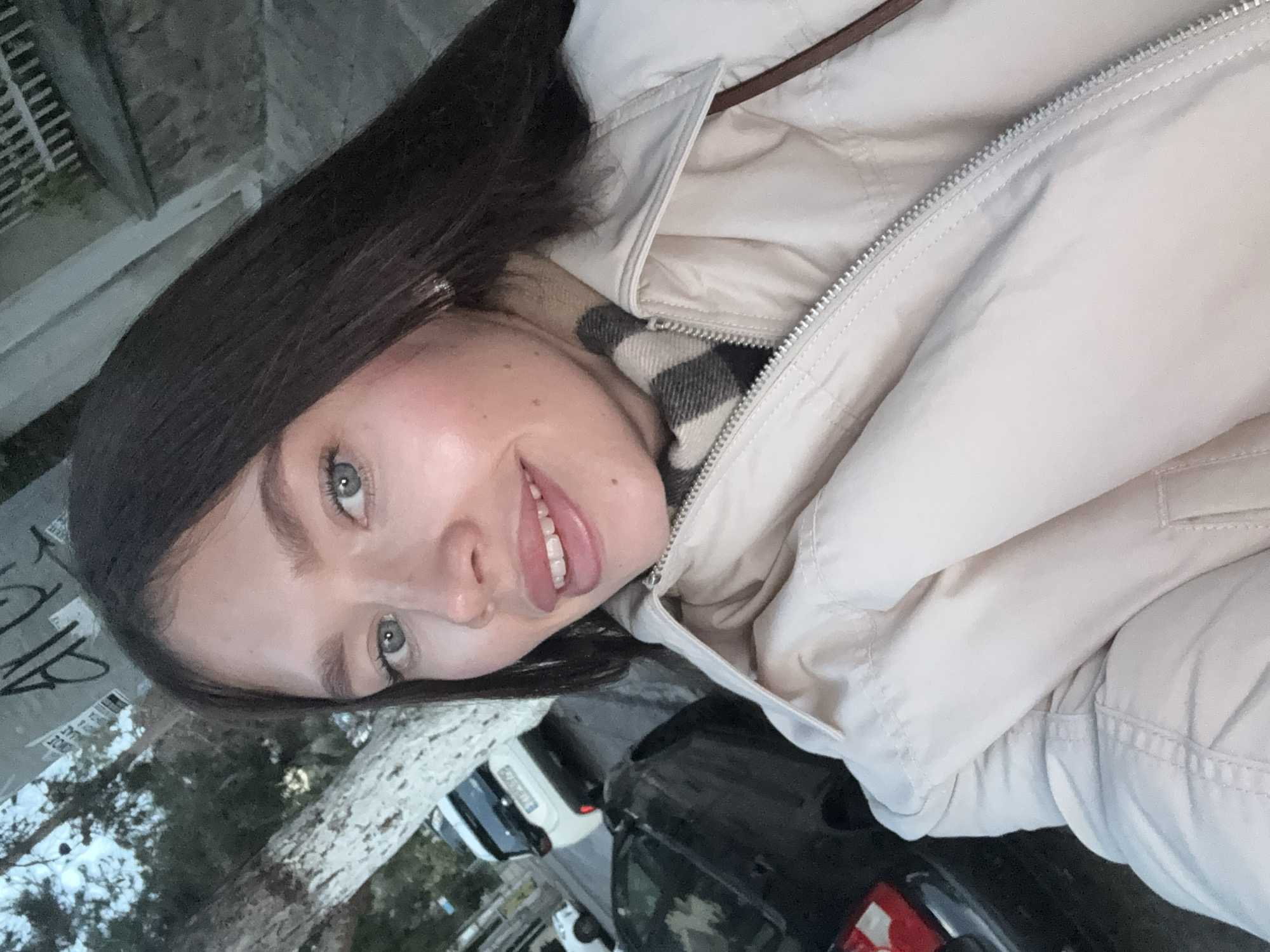 A female individual is captured in a close-up, eye-level selfie-style photograph taken on a street in the Municipal Unit of Elliniko, Greece