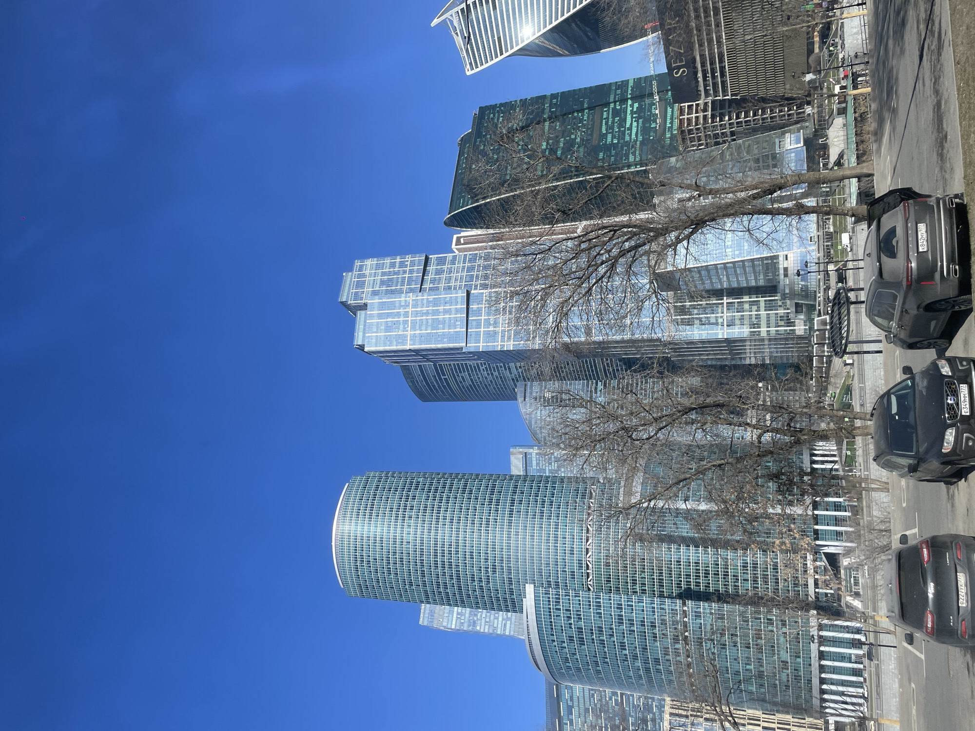 view of Moscow's International Business Center (Moscow City) in Russia. Several modern skyscrapers dominate the scene with their glass facades reflecting the blue sky. Leafless trees stand in the foreground, partially obscuring the buildings. Several cars are parked along a street visible on the right side of the image. The sky is clear and bright.