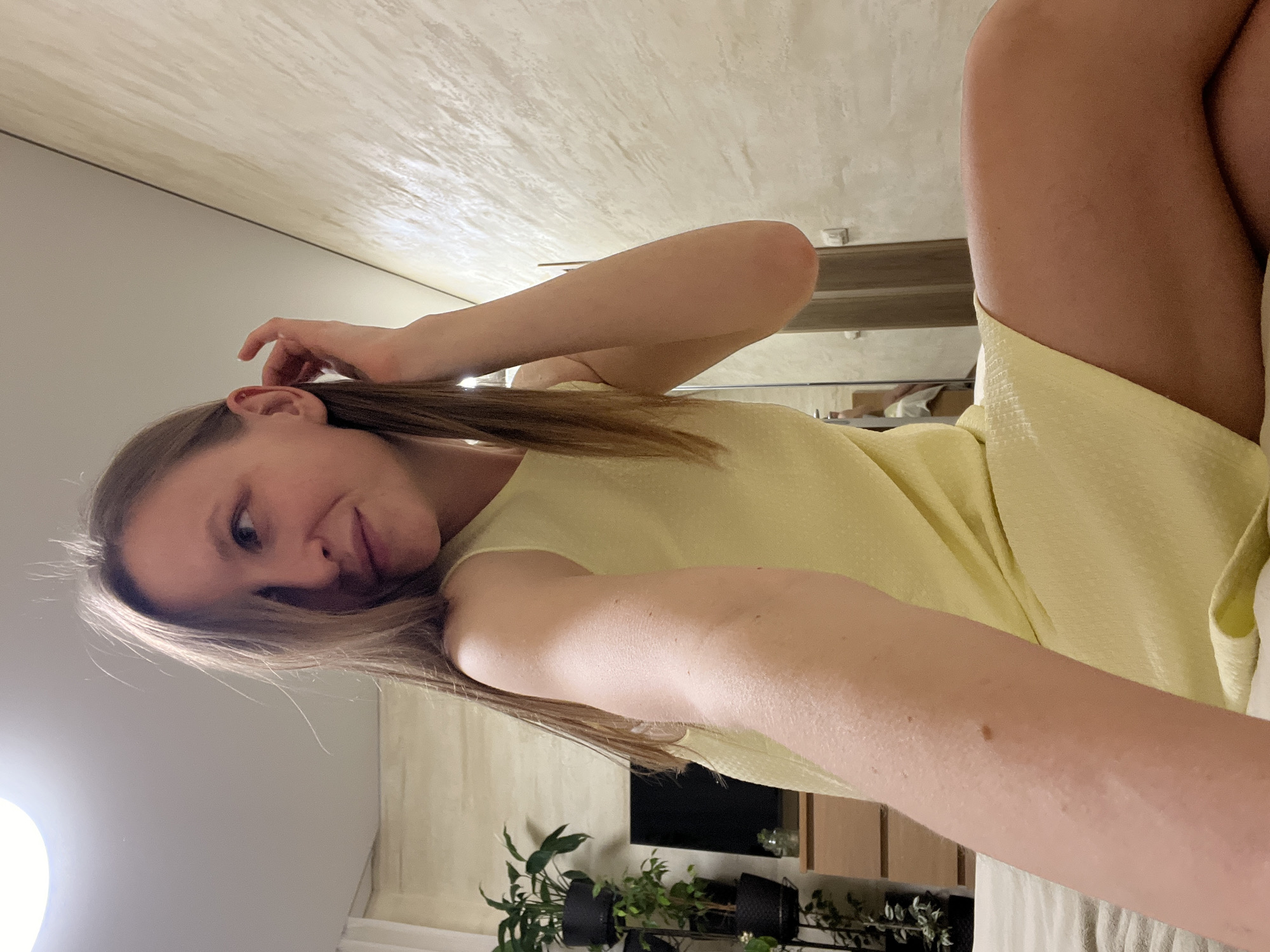 A woman with fair skin and light brown hair wearing a pale yellow dress is positioned diagonally in the frame. She is indoors, evidenced by a patterned ceiling and a white wall. There are several potted plants, including what appears to be a monstera, and wooden furniture in the background. A television is mounted on the wall. There is no specific evidence indicating the image was taken in Gelendzhik, Russia.