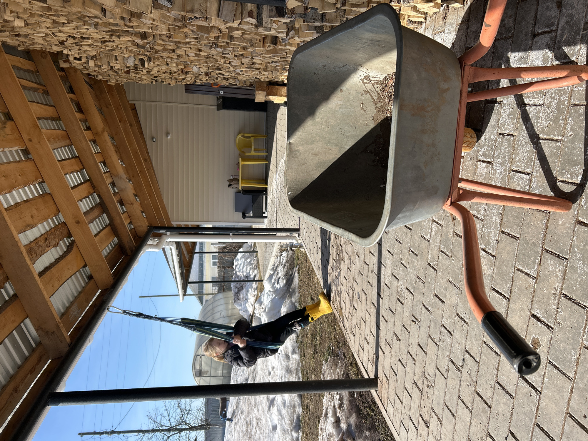 young girl swinging in a hammock suspended under a wooden structure. She is wearing a dark jacket, dark pants, and bright yellow rain boots. In the background, there's a large stack of firewood under the structure. To the right of the swing, a wheelbarrow is parked on a paved surface made of rectangular blocks. Patches of snow are visible on the ground, indicating a cold climate. A building with siding and what appears to be yellow chairs can be seen in the background. The image was taken in Уральское, Russia.