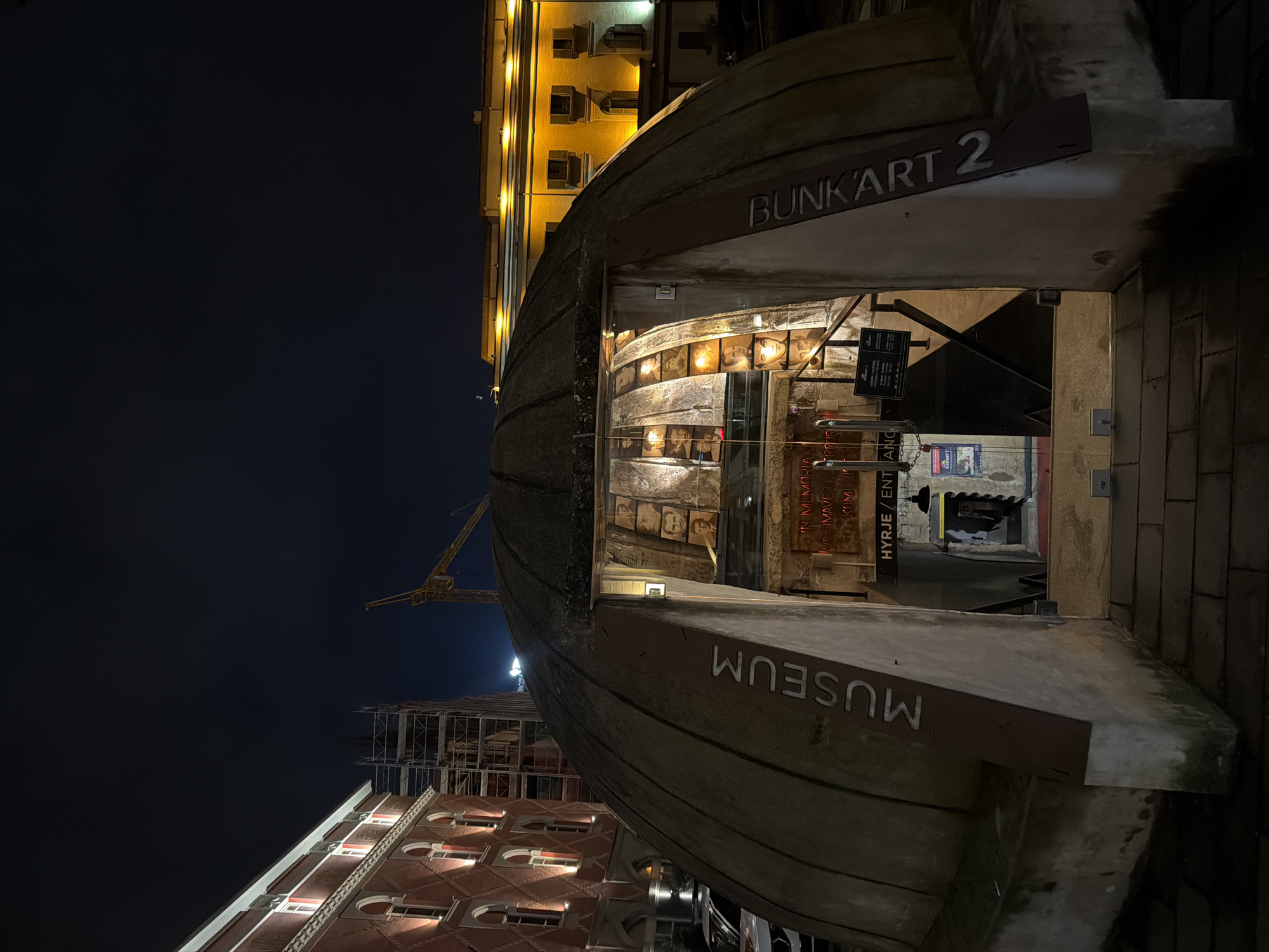 The image depicts the entrance to the Bunk'Art 2 Museum in Tirana, Albania, at night. The central subject is a large, grey, dome-shaped concrete structure, the entrance to an underground bunker museum. The word "MUSEUM" is vertically inscribed on its left flank, and "BUNKART 2" is vertically inscribed on its right flank. The central entrance, marked "HYRJE / ENTRANCE," leads downwards into a brightly lit interior where multiple framed portraits of individuals are displayed along the walls, along with a red neon sign reading "IN MEMORIAM..." followed by Albanian text. The ground leading to the entrance consists of dark paving stones. To the left of the bunker, a multi-story building with reddish-brown walls featuring a diamond pattern and arched, illuminated windows is visible. A white vehicle, possibly a sedan with a visible roof light bar, is partially parked in front of this building. Behind this building, scaffolding is present, suggesting construction or renovation, with a large yellow construction crane partially visible further back. To the right and in the background, another multi-story building with a yellow facade and illuminated windows stands, illuminated with a warm yellow light. The sky above is dark, indicating nighttime conditions. No discernible individuals are actively interacting with the immediate foreground.