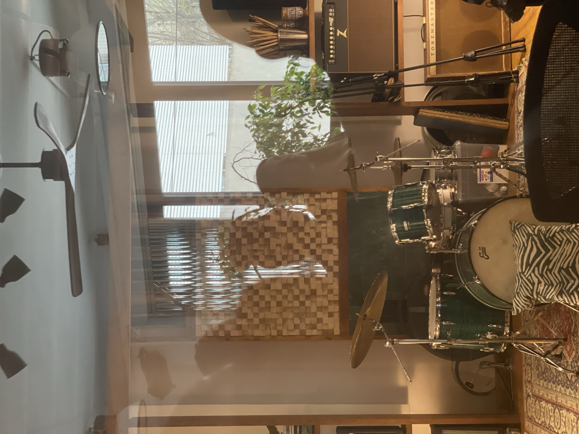 The image displays an indoor music studio or practice space. No explicit visual markers are present within the image to confirm the city of Barcelona, Spain, as the location. The scene features a drum set with a teal/green finish, positioned centrally on an patterned area rug. A bass drum with an "Evans" logo on the drumhead is visible in the foreground, with a zebra-print pillow resting on the floor in front of it. To the left, a floor tom and cymbal are present, and another cymbal is mounted above the bass drum. Behind the drum set, against the wall, a wooden acoustic diffuser panel made of small square blocks is mounted, adjacent to a textured wavy acoustic panel. To the right of the drum set, two music amplifiers are stacked on a wooden shelf. The top amplifier bears a "Dr. Z" logo, and the lower one is labeled "TONEMASTER." A cluster of drumsticks is stored in a cylindrical metal container on a shelf above the amplifiers, next to a potted green plant with multiple branches and leaves. Various microphone and instrument stands are visible near the amplifiers and drum set. The background includes a large window fitted with horizontal blinds, offering a partial view of an exterior residential or urban environment with trees and a building facade. The ceiling features at least two ceiling fans, one of which is a dark-colored, multi-blade unit, and several recessed light fixtures. The back of a dark, mesh-backed chair is visible in the immediate foreground, suggesting the perspective of a seated observer. The lighting suggests daytime, with natural light entering through the window. No people are visible in the scene.
