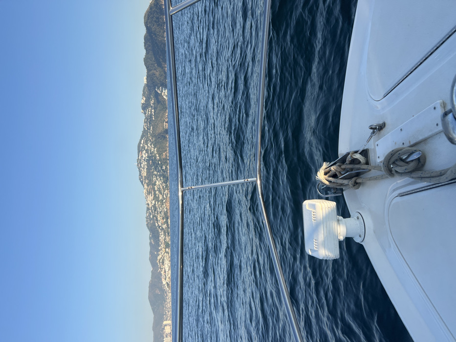 From the deck of a boat, the scene overlooks a calm, blue sea with a distant coastline of mountainous terrain dotted with white buildings under a clear, bright blue sky. A stainless steel railing runs along the edge of the boat, and white boat fixtures including an anchor and light fixture are visible in the foreground. The image is oriented with the boat on the right side.