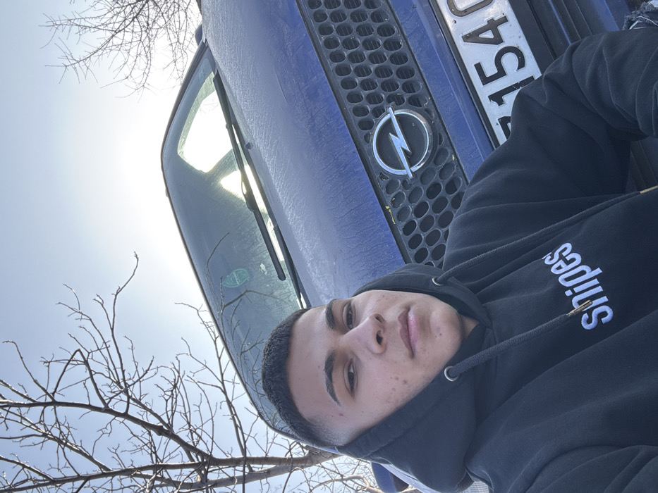 An outdoor scene in Oryahovo, Bulgaria, depicts a young male subject in the foreground, positioned to the left. He has short, dark hair with a fade haircut and wears a black hooded sweatshirt with "Snipes" embroidered in white on the chest. He is looking directly forward. To the right and behind him is the front portion of a dark blue Opel vehicle, possibly an SUV or van, angled slightly. The vehicle's hood, windshield, and a section of the grille with the Opel logo are visible. A partial Bulgarian license plate, displaying characters "7154 O", is present on the lower front of the vehicle. The windshield shows light frost or condensation and has two wipers, with a small green sticker or air freshener visible on its upper left. The background features a clear, bright blue sky with a visible sun creating strong highlights, and the bare branches of a deciduous tree. The lighting indicates daytime.