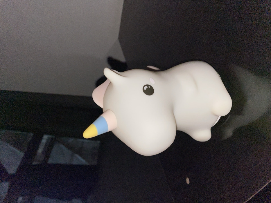 A small, white unicorn toy rests on a glossy black surface