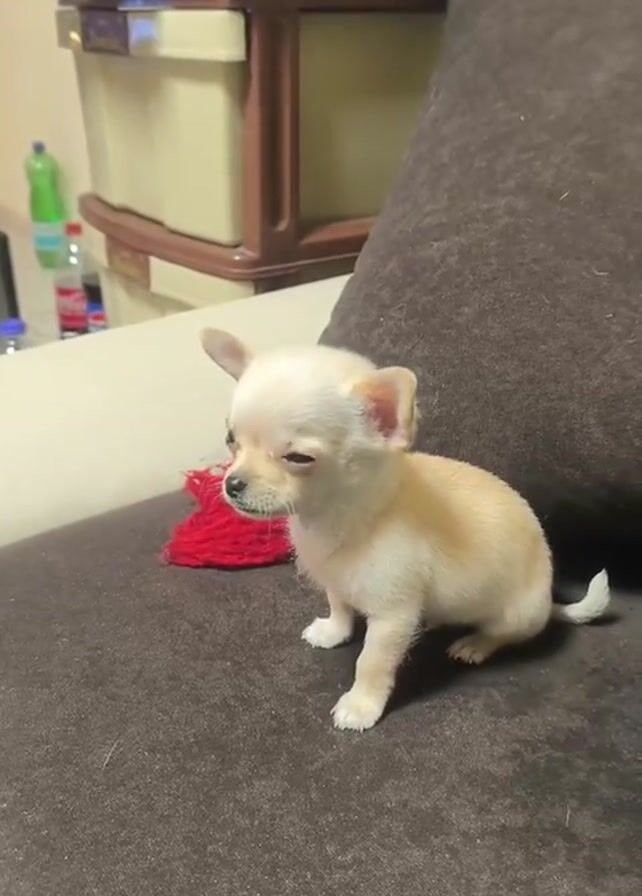 A small, light beige Chihuahua puppy stands on a dark brown fabric surface, likely a couch