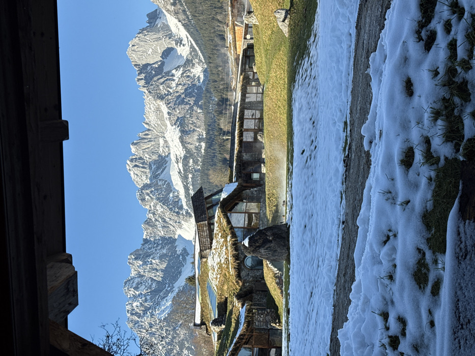 The image depicts a panoramic view of a distinctive architectural complex set against a backdrop of snow-capped mountains in Going am Wilden Kaiser, Austria. The scene is observed from under a dark, wooden overhang. In the foreground, patches of melting snow are scattered across green grass, revealing underlying vegetation. A partially snow-covered path or road traverses the lower mid-ground. The mid-ground features a series of low-profile buildings characterized by extensive green, grassy roofs, interspersed with sections of wooden shingles and multiple skylights. The structures incorporate natural stone cladding and large, angular windows that reflect the bright blue sky. A prominent, dark natural boulder is positioned in front of one of the buildings. To its right, a plume of steam or mist rises from the ground, possibly indicating a geothermal or heated water feature. Small, dark, indistinct figures, potentially waterfowl, are present near the steam. The background is dominated by a clear, deep blue sky above a majestic range of snow-covered mountains with rugged, exposed rock peaks. The mountains appear sharply defined under bright sunlight. The overall environment suggests a crisp, sunny day with remnants of winter snow. No explicit human figures or interactions are discernibly present.