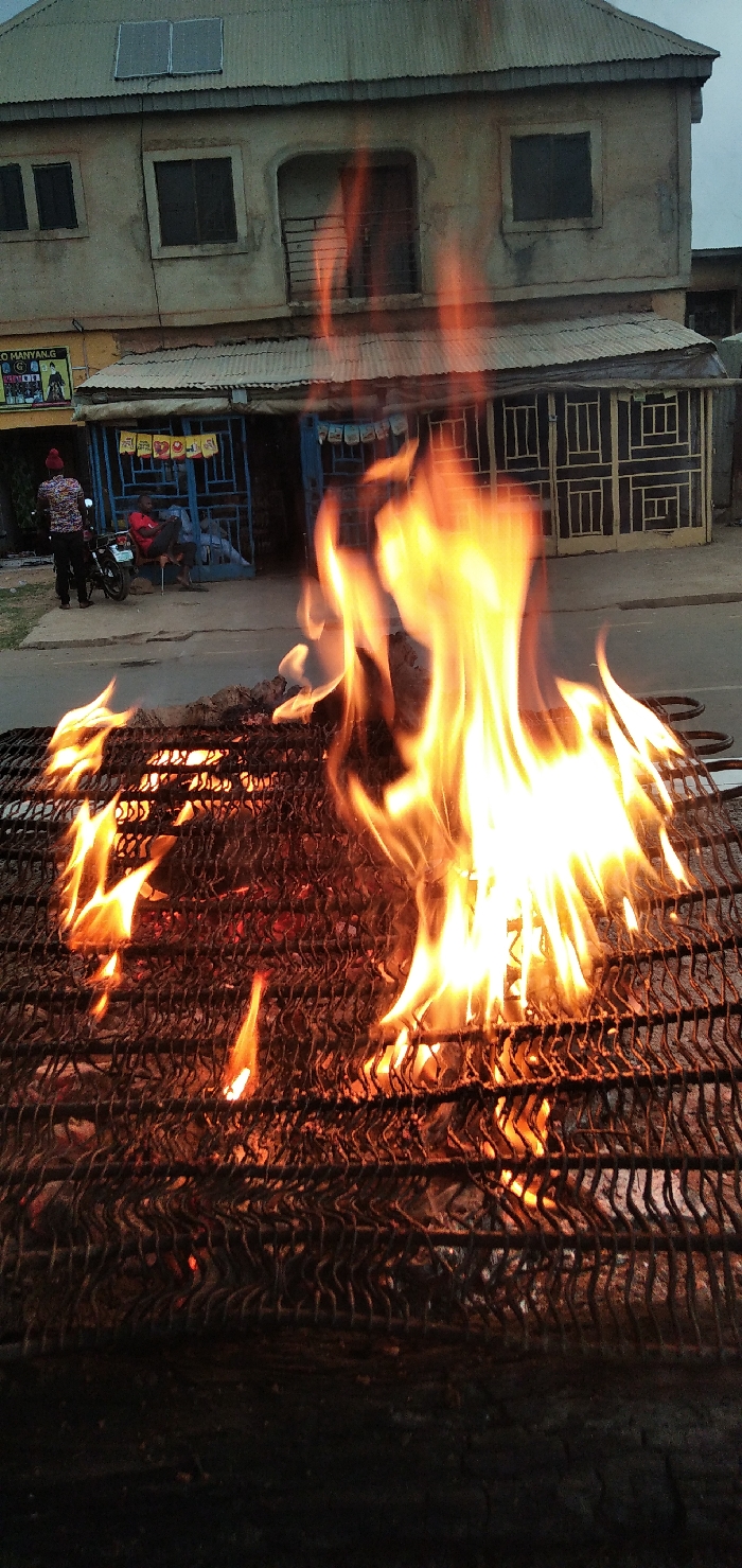 A vibrant fire blazes on a black, textured grill. The flames are orange and yellow, reaching upwards. In the background, a two-story building with solar panels on the roof and several windows is visible. A small shop with people and a motorcycle is to the left of the building. The background is slightly out of focus, drawing attention to the intense fire in the foreground.