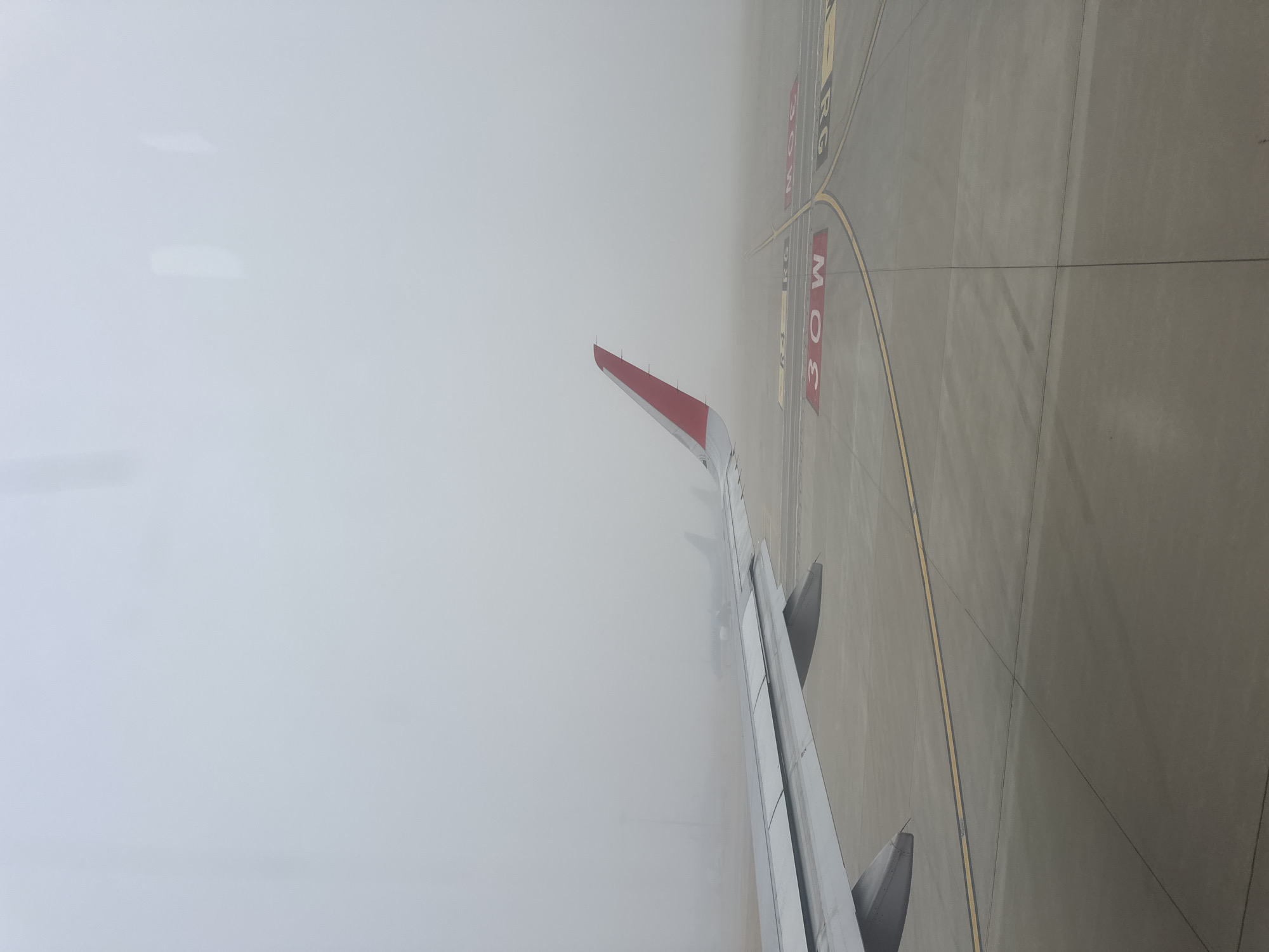 The image captures an aircraft's perspective from a passenger window onto an airport tarmac, specifically Incheon International Airport in Incheon, South Korea. Dense fog permeates the environment, severely limiting visibility. In the immediate foreground, the grey-silver wing of the aircraft occupies the lower-left and central portions, extending towards the right. A prominent red wingtip is visible on the far end of the wing. Two engine nacelles are partially visible beneath the wing. The aircraft is positioned on a concrete taxiway or apron, distinguished by yellow double centerline markings. Red and white painted ground signage is visible, including "30W" prominently displayed in a red box, along with partial markings such as "RG" and "R4". Through the fog in the distant background, indistinct silhouettes of other aircraft and a tall, slender mast-like structure are faintly discernible. No individuals are visible in the scene. The aircraft appears to be stationary or taxiing slowly.