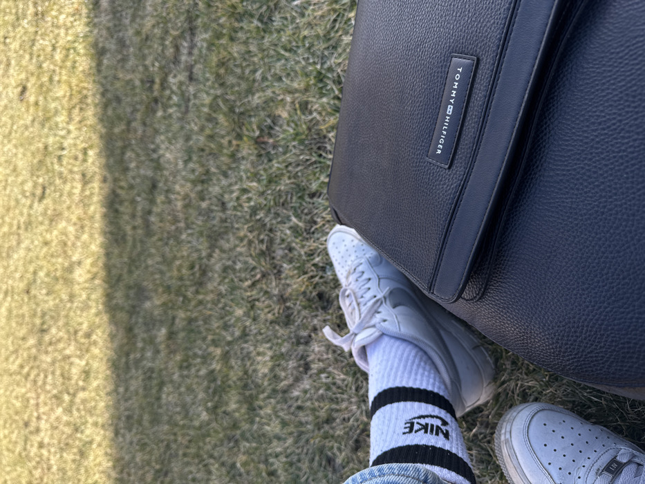 The image depicts a close-up, low-angle perspective of an individual's lower legs and a bag resting on green grass. The subject's left foot wears a white athletic sneaker, consistent with a Nike Air Force 1 model, with white laces and a perforated toe box. The right lower leg is visible, clad in a white athletic sock featuring two black horizontal stripes and the vertical "NIKE" logo in black lettering. Above the sock, a section of light blue denim fabric from trousers is visible. Adjacent to the feet, on the right side of the frame, lies a black, textured messenger bag or briefcase. The bag has a flap closure, and a silver-colored rectangular plaque affixed to the flap displays the "TOMMY HILFIGER" brand name and logo in white text. The ground consists of mixed green and yellowish-brown grass, suggesting varying states of dryness or sunlight exposure. A distinct shadow line diagonally crosses the upper-middle portion of the grass background. No discernible landmarks or architectural features are present to identify a specific location within Iași, Romania.