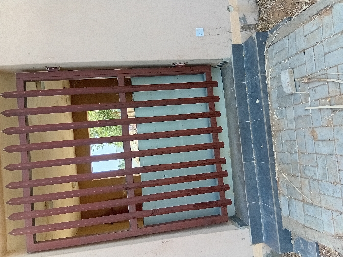 The scene depicts the exterior of an entrance in Ayama, Nigeria. A full-height, reddish-brown metal gate is set within a light beige stucco wall. The gate features vertical bars with pointed tops, and its lower half is fitted with a light blue panel. It is slightly ajar to the right, exposing a metal hinge mechanism and a glimpse of the building's interior. Through the gate, an internal space with a window is visible, showing exterior green foliage and a bright sky. On the exterior wall to the right of the gate, a blue electrical outlet is present, with minor discolored marks below it. Two dark grey tiled steps lead up to the gate. The ground immediately beyond the steps is paved with light grey rectangular pavers, soiled with dirt, dust, and scattered dry plant debris, including several small sticks. A single light-colored brick rests on the paved surface in the right foreground. The adjacent ground consists of dry, dusty soil. No individuals are present.