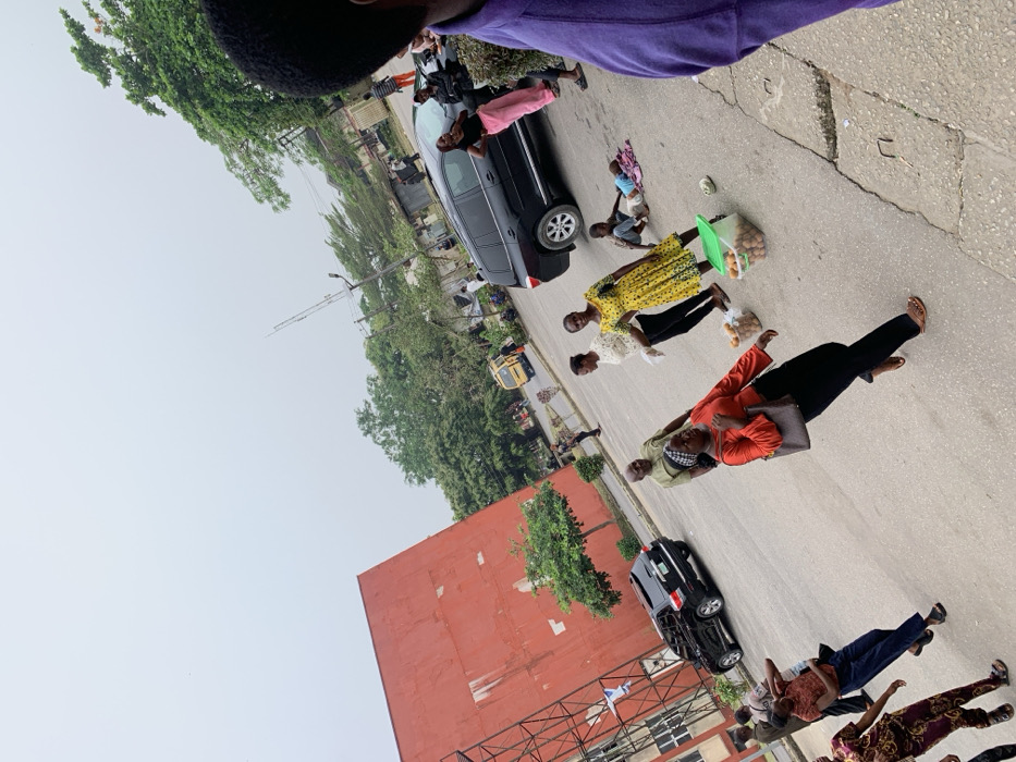 A street scene unfolds with a cluster of people. Several women are visible, some holding goods in bags. One woman wears a yellow dress, another an orange top with black pants. A few children are among the group, including one in pink. Cars are parked on the street, one of which is a black van. A red brick building rises in the background alongside lush trees, and a bright sky is above.