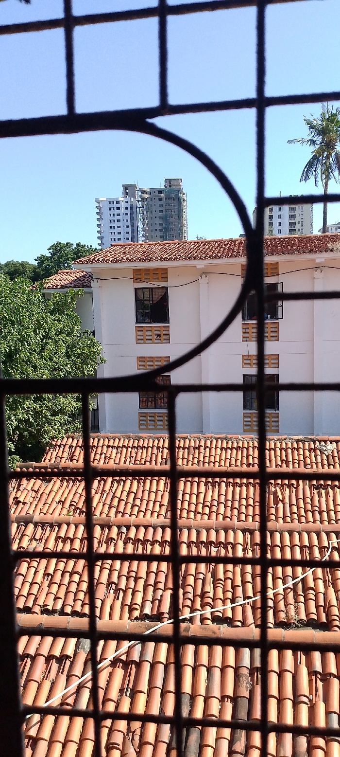 The image presents an exterior view of an urban landscape in Tudor ward, Kenya, framed by dark, grid-patterned metal security bars from a foreground structure. The lower and central portions of the scene are dominated by a terracotta-tiled roof, featuring numerous reddish-brown barrel or mission style tiles. A white cable or pipe traverses these tiles diagonally from the lower-left to the mid-right. Above this roof, a white, multi-story building with its own similar terracotta-tiled roof is visible. This building features multiple dark-framed windows, some partially open, and distinctive rectangular, light-colored ventilation blocks or decorative elements positioned beneath and beside the windows. A dense green tree partially obscures the left side of this white building. In the background, against a clear light blue sky, several taller, modern multi-story buildings are visible. Two prominent structures appear to be under construction or newly built; one is predominantly white, while the other exhibits a gray facade, possibly with visible structural elements or scaffolding. A third, partially visible building, also multi-story, is located on the far right. A tall palm tree stands on the right side of the background, extending above the distant buildings. No individuals are visible in the scene.