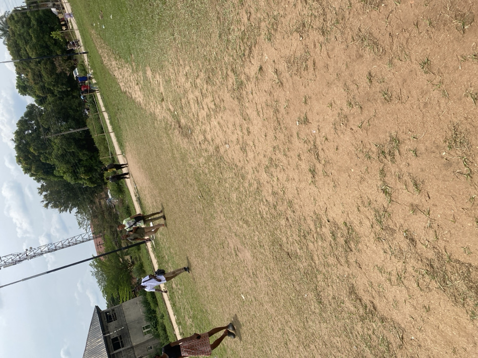 The image depicts an outdoor scene in Ihiagwa, Nigeria, characterized by an expansive area of reddish-brown earth mixed with sparse green grass under a partly cloudy sky