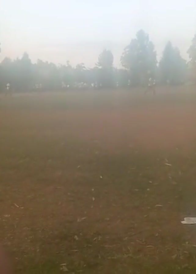 group of people on a grassy field, possibly playing a sport. The view is somewhat obscured by fog or haze. There are trees visible in the background, lining the edge of the field. The field appears to be well-worn, with patches of brown earth showing through the grass. There is a piece of white trash on the ground in the foreground. The camera is shaky, and a finger briefly covers part of the lens at the bottom left of the frame.