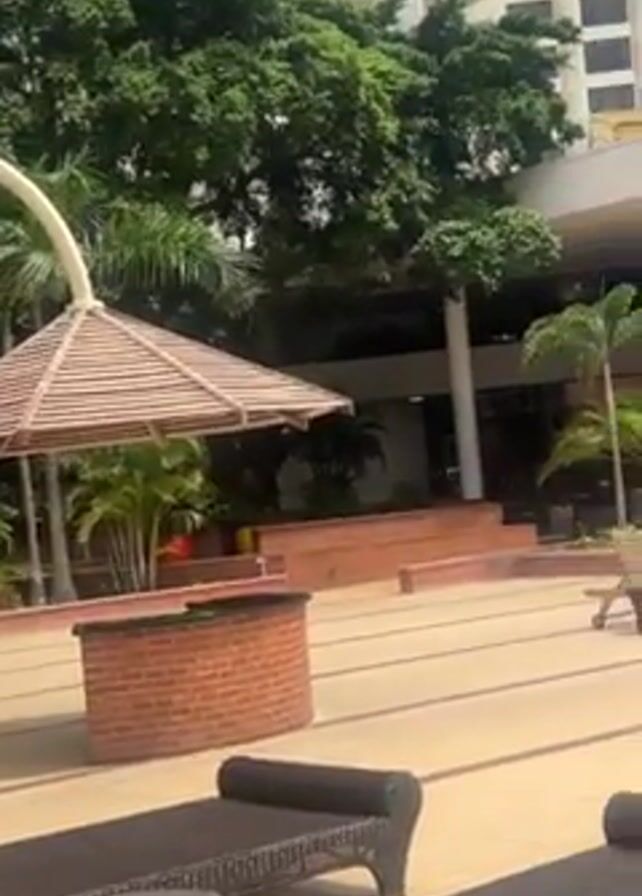 The camera pans slowly across an outdoor pool area at a hotel