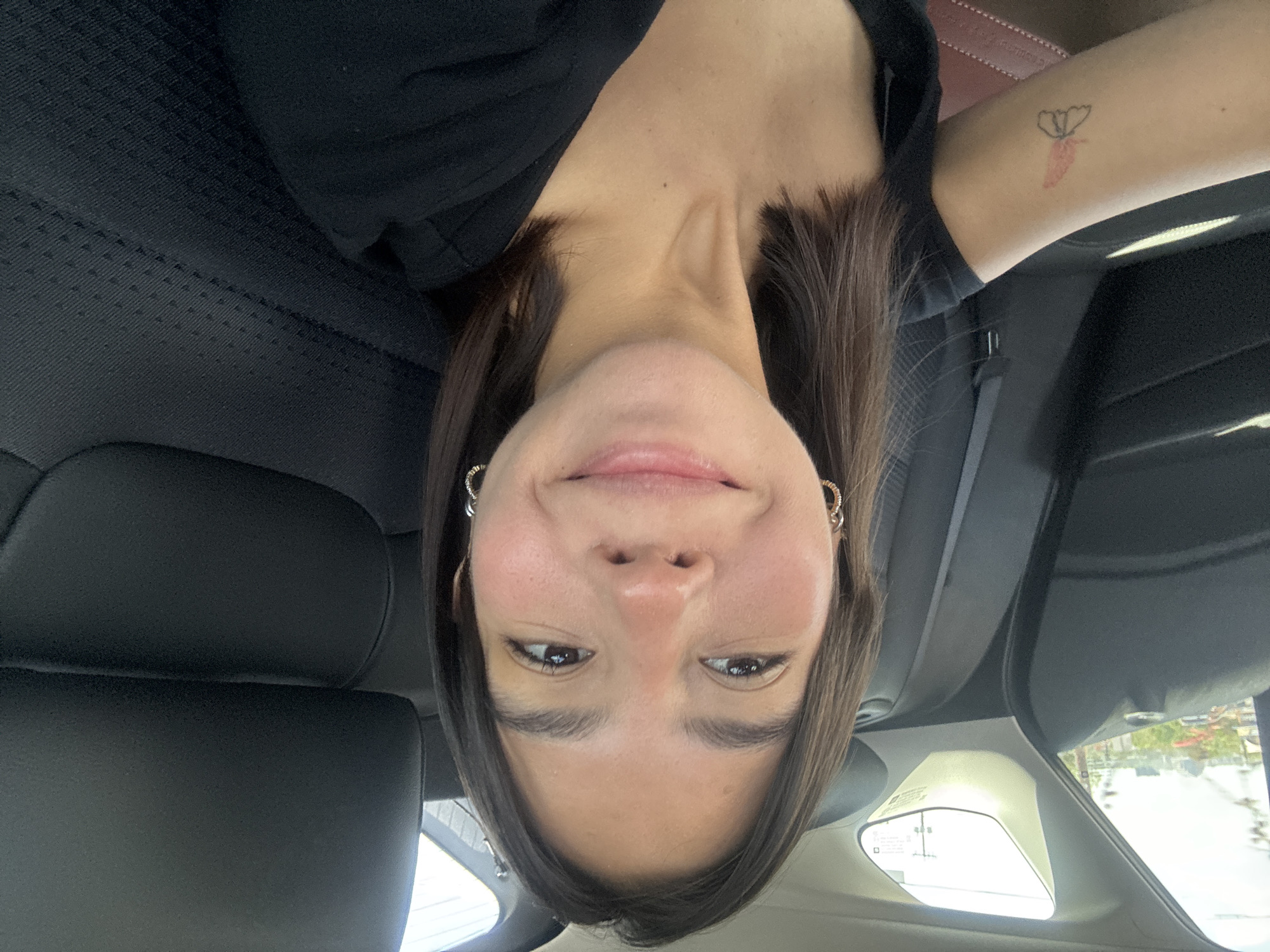 A female is positioned in the rear passenger seat of a vehicle, capturing a self-portrait. She has shoulder-length brown hair, a light complexion, and a smiling expression, directly facing the camera. She wears a black top and gold-colored hoop earrings. A tattoo depicting a red flower with a black outline is visible on her right bicep. The vehicle's interior features black, textured seating and a reddish-brown lower trim panel on the rear door. Through the vehicle's window, a sunlit urban landscape is visible in the background, including distant buildings, utility poles, and a distinctive tower structure identifiable as the Tower of the Americas in San Antonio, Texas, United States.