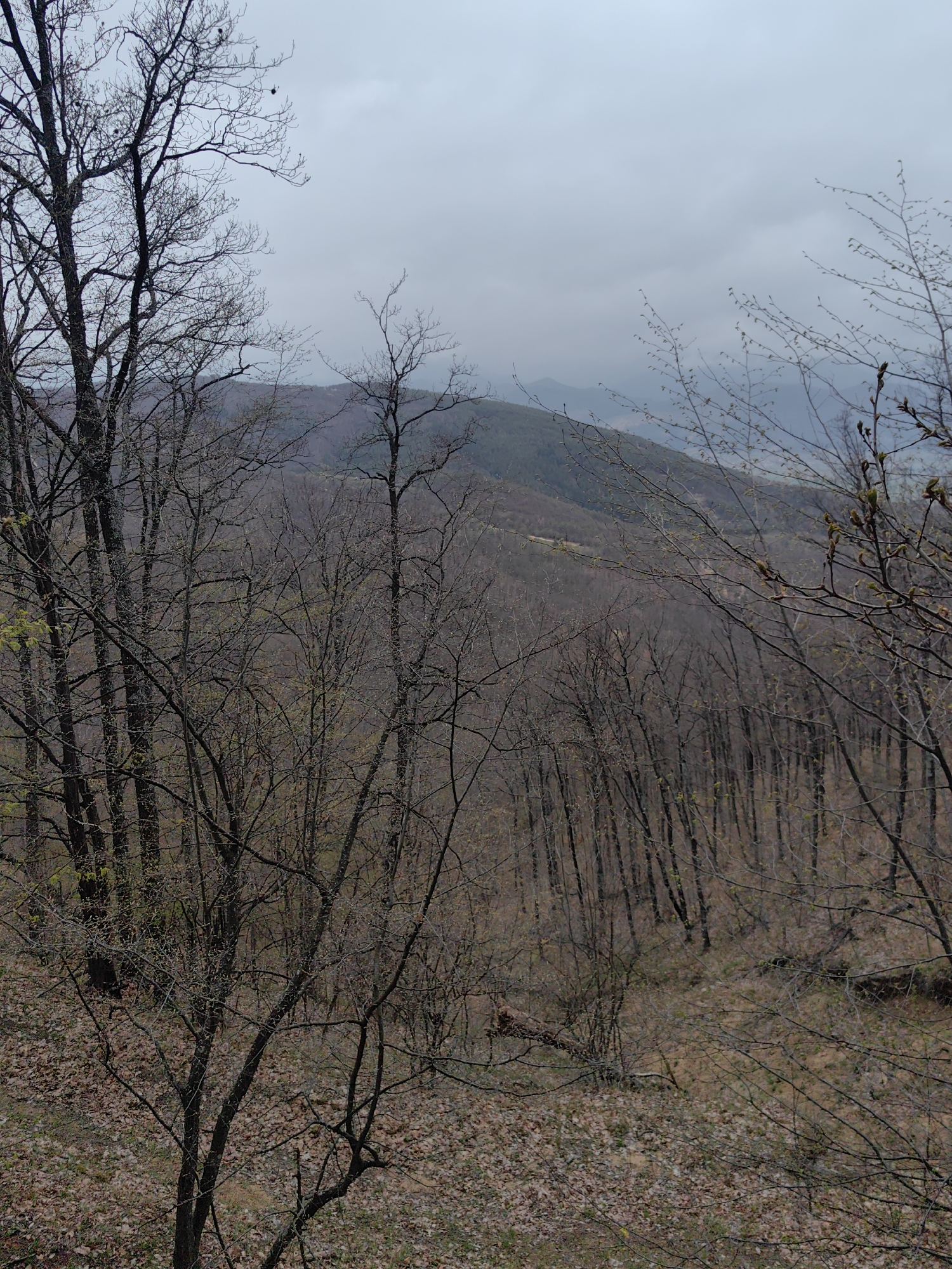 forested hillside in a possible mountainous region. Bare trees dominate the foreground and midground, with a few displaying early bud development. The ground is covered in fallen leaves. In the background, a hazy mountain range is visible under a cloudy sky. The location is possibly near or around the outskirts of the city of Slatina, Bulgaria.