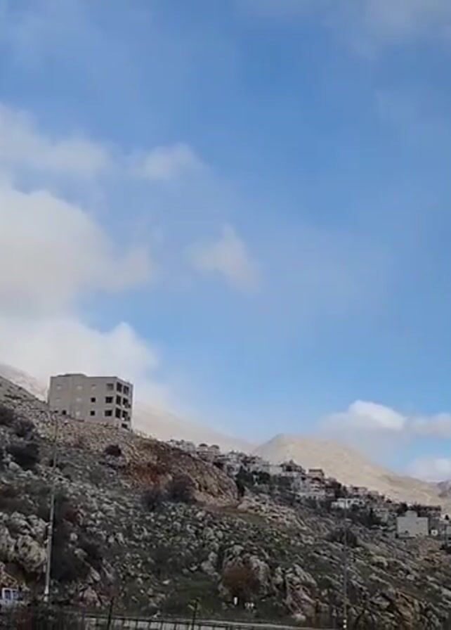 hillside town under a cloudy sky. Initially, the sky is bright blue with scattered white clouds, but the clouds become denser and grayer as the video progresses. Buildings of various sizes are scattered across the hillsides. Some are under construction. In the foreground, there are several cars parked near what appears to be a small building or shed. The overall impression is of a town nestled in a mountainous region.