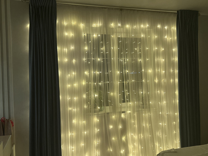A window is adorned with sheer, light-emitting diode (LED) curtain lights