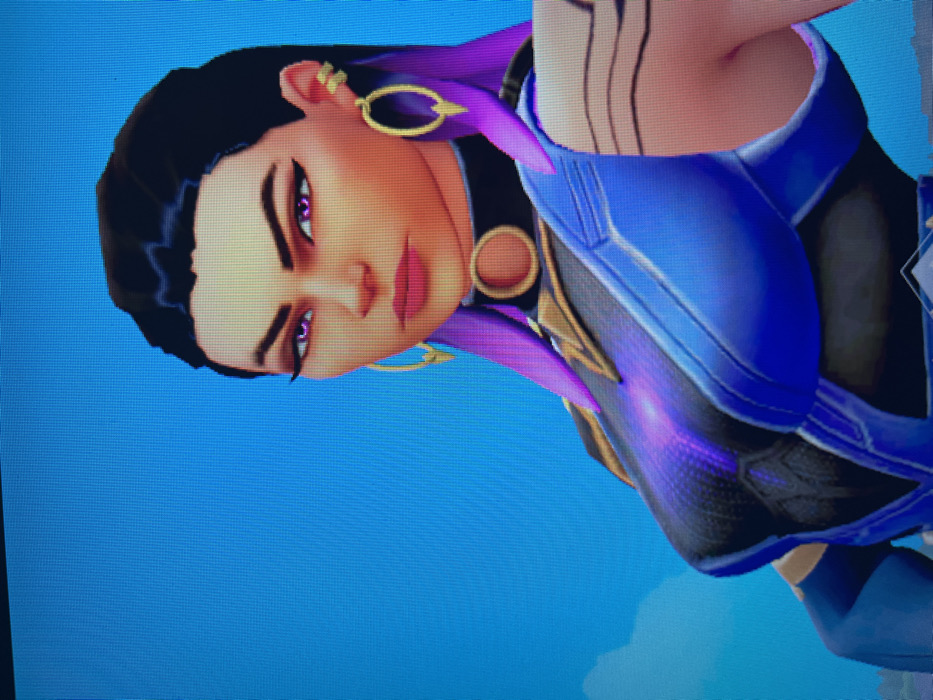 The image displays a close-up, waist-up digital rendering of a stylized female character, captured from a screen. The subject has dark hair, partially styled with vibrant purple streaks, framing her face and extending over her shoulders. Her face is characterized by sharp features, including prominent purple eyes with dark, extended eyeliner, arched eyebrows, and full red lips set in a serious expression. She wears multiple gold-toned earrings, notably large hoops with a pointed teardrop design and a smaller cuff on her right ear. A black choker with a central gold ring accessory encircles her neck. Her attire consists of a form-fitting, dark garment with glowing purple accents on the chest, overlaid by a structured, bright blue upper body armor or uniform segment. The character's left upper arm shows several horizontal, dark line markings. The background is a plain, uniform light blue, indicating a digital interface or character selection screen rather than a real-world environment. This image does not depict a location in the city of Caen, France, but rather a digital scene from a video game.
