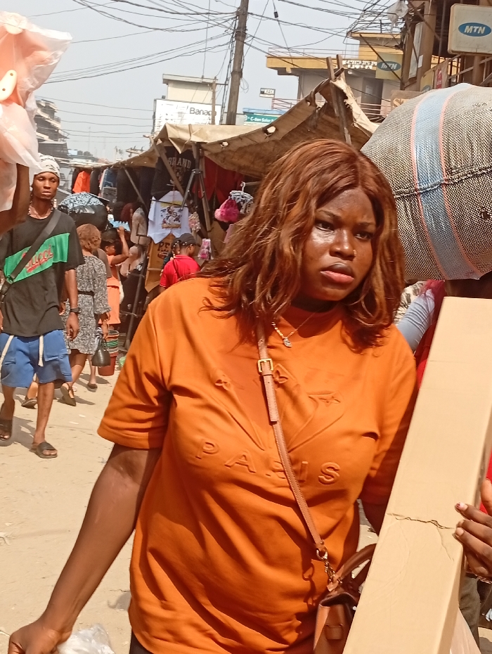 A woman wearing an orange t-shirt with the word "PARIS" embossed on the front is holding a cardboard box in a busy outdoor market. She has brown hair and a small handbag slung across her body. People mill about in the background amongst stalls covered with tarps, clothes, and goods for sale. Overhead, a tangle of wires creates a dense web against the sky. Signs for "Banaco" and "MTN" are visible in the distance.