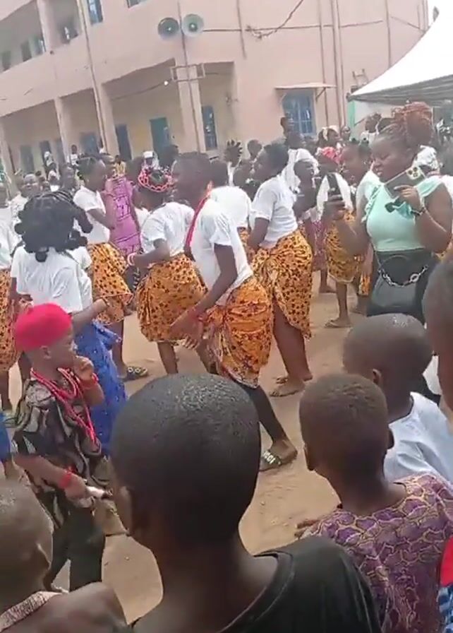 A group of children and adults are dancing outdoors in front of a light-colored building. The children wear white shirts and patterned skirts or wraps. Some wear beaded necklaces and headbands. Adults also wear traditional clothing or are dressed casually. Some are taking videos with their phones. The ground is dirt. There are other people in the background.