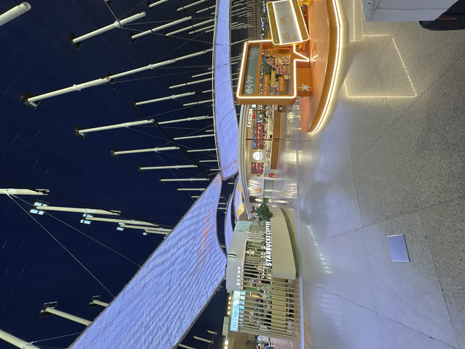 This image depicts a large, brightly lit indoor concourse at Shanghai Pudong International Airport (PVG) in Pudong, China. The expansive area features a high, dark blue ceiling from which numerous thin, white vertical support pillars extend upwards. Suspended from these supports are several large, curved, tent-like fabric structures, illuminated internally with a cool blue-white light and showing hints of orange patterning. The floor is composed of light-colored, reflective tiles. In the mid-ground on the left, a Starbucks Coffee establishment is visible, identified by its green and white logo on a curved counter structure. Behind this, a seating area with vertical wooden slat partitions contains several indistinct individuals. Further to the right, another retail store named "FASCINO" displays food items, likely baked goods, behind a glass counter. In the right foreground, a large, orange, illuminated display platform shaped like a speech bubble rests on the floor. This platform features integrated LED strip lighting along its base and contains merchandise, along with visible numerical text "2025" and "2026" on a vertical sign. A small, square, reflective object lies on the tiled floor in the left foreground. The environment appears clean and sparsely populated.