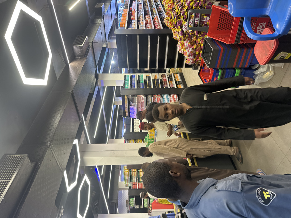 The image displays the interior of a supermarket, specifically "Tufi Mart," located in Babban Giji, Nigeria