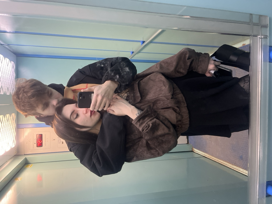 The image captures two individuals in an elevator located in the city of Engels, Russia, reflected in a mirror-like surface. A young female in the foreground, facing right, holds a black smartphone in her right hand, using it to take the photograph. She has long, dark hair, a light complexion, and is wearing a brown suede-like bomber jacket over a black skirt and patterned hosiery. A tattoo is visible on her left forearm. Behind her, a young male embraces her from the back. He has light brown, tousled hair and wears a dark hooded jacket, partially speckled with white on the sleeves, and a beige and brown plaid scarf around his neck. His right arm is wrapped around the female's left shoulder, and his left hand clasps her left hand. The elevator interior features pale blue-green walls and an off-white control panel on the back wall with a red digital display showing the number "2." The floor appears to have a patterned blue-grey surface. A black bag or object is partially visible at the bottom right, near the female's leg.